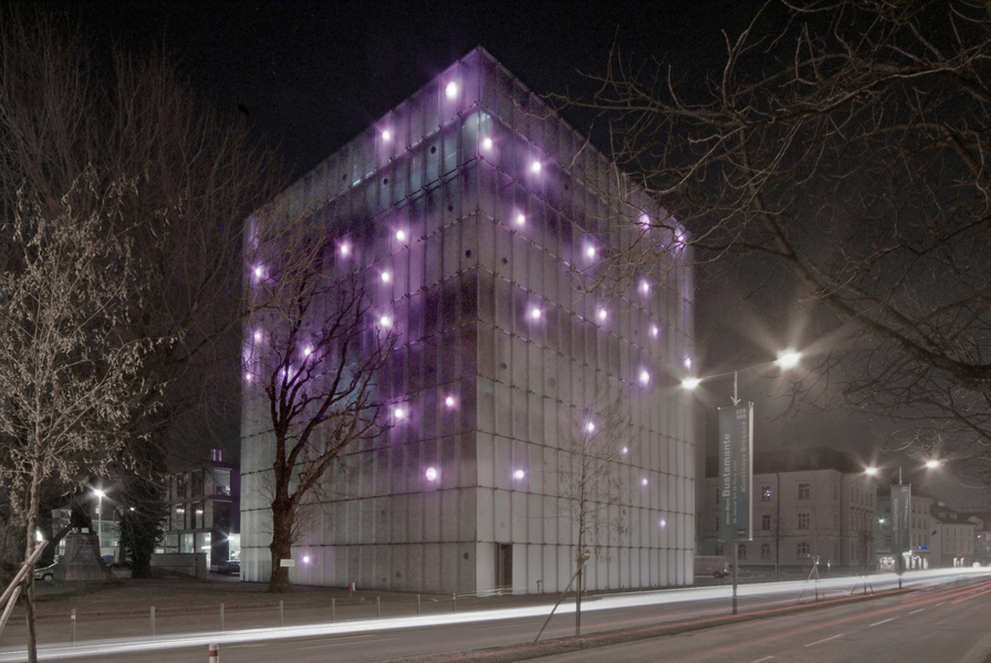 Celle-ci dégageait une impression d’ensemble de grande vulnérabilité et de vibration sourde, comme au ralenti. A intervalles irréguliers, la façade s’empourprait soudainement, à pleine puissance. C’était toujours un moment surprenant. Diffusant la lumière alentour, l’édifice embrasait silencieusement son environnement par la couleur. Cette illumination était alors perceptible de très loin, des villages voisins et des hauteurs des montagnes environnantes. Les réflexions sur l’eau étaient particulièrement intéressantes, depuis l’autre côté du lac de Constance ou en approchant l’immeuble depuis le port. La population de Bregenz, de la région du Vorarlberg et les visiteurs du KUB apprécièrent l’installation et sa délicatesse énigmatique liée à une tension sous-jacente. C’était le sujet de conversation de la ville et beaucoup auraient souhaité qu’elle reste en place.