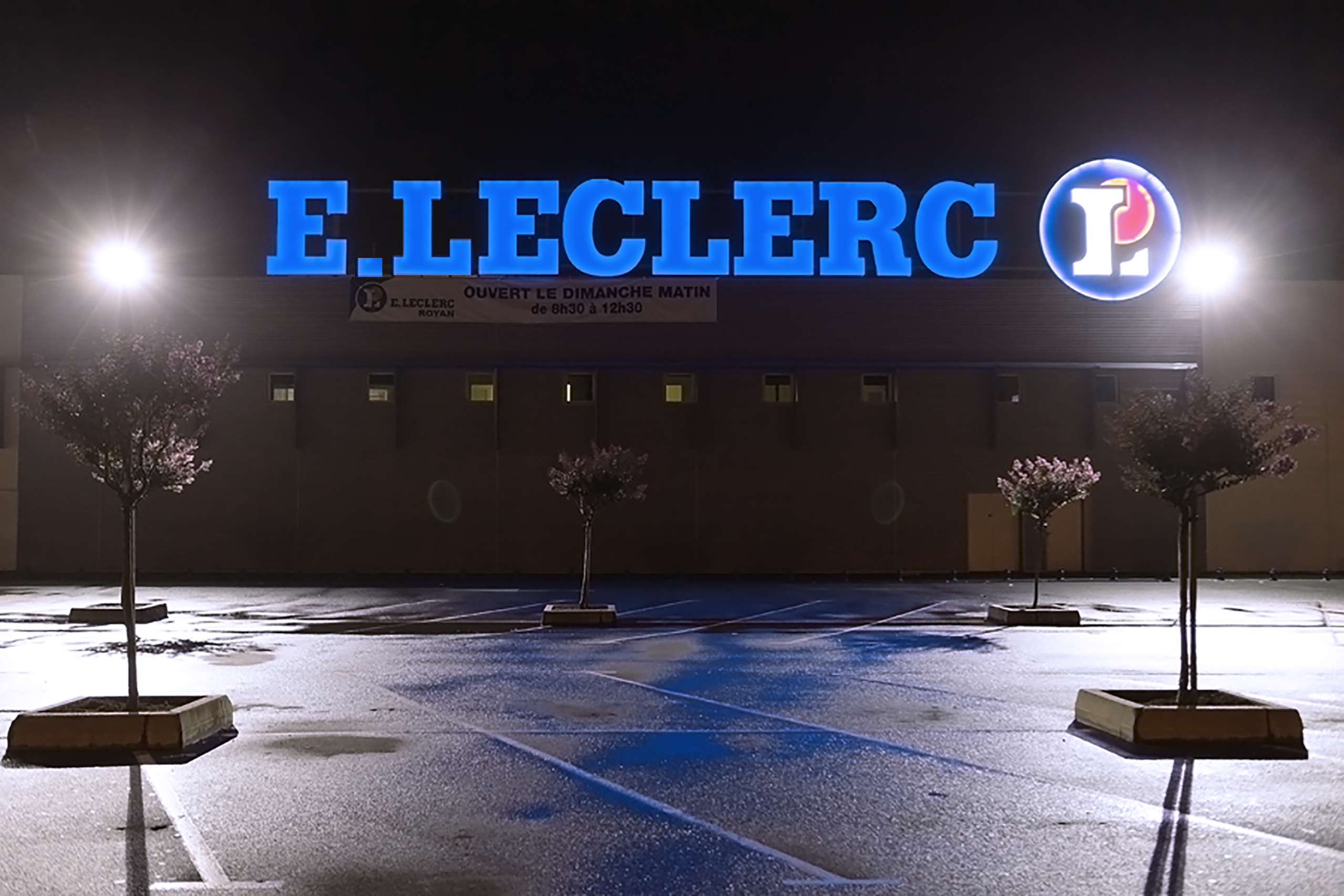 Cette captation d’un parking d’un centre commercial et de son enseigne dysfonctionnante était diffusée en boucle sur l’ordinateur portable de la maison. Après un orage, un des L de l’enseigne bégayait sa lumière par saccades, qui se reflétaient légèrement, en bruissement visuel, dans l’aplat de couleur créé sur le bitume mouillé.