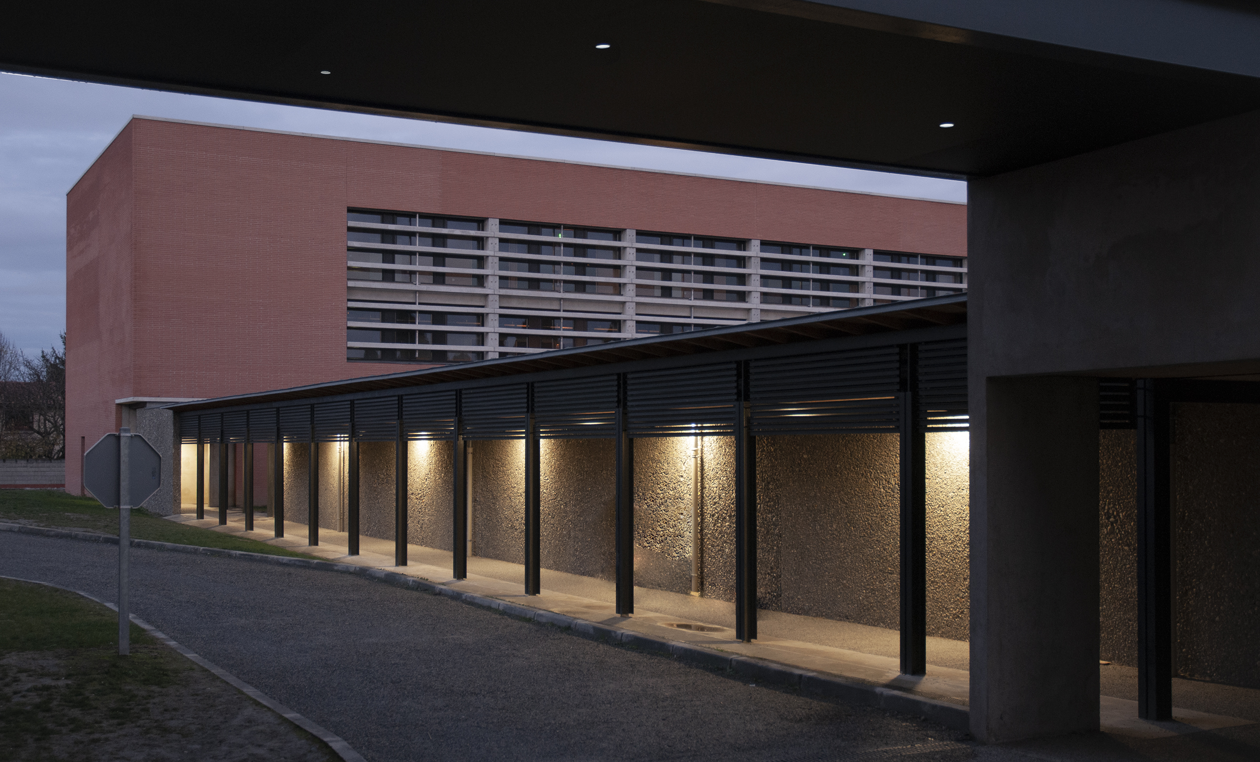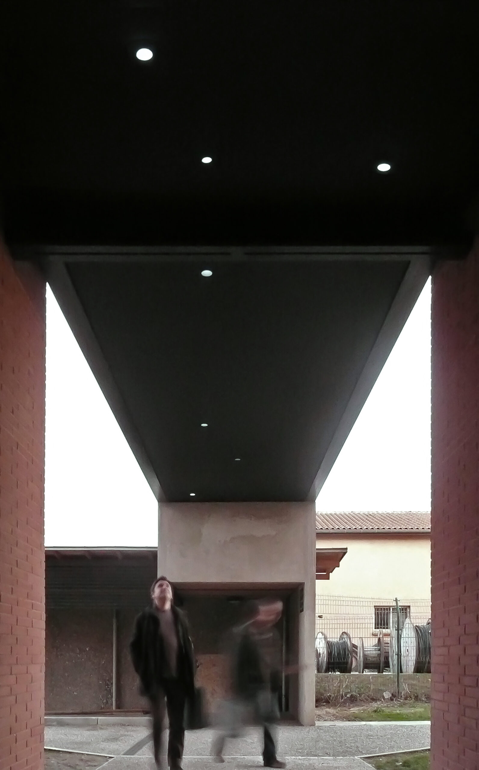 La sobriété équilibrée, massive, albigeoise par bien des aspects, des constructions de l’extension du lycée, m’a orienté vers une recherche d’homogénéité avec la vision mise en oeuvre par les architectes et l’idée d’un plafond de lumière ayant découlée du choix du site, m’est apparue évidente la nécessité de frugalité chromatique (en plus, de la logique éco-énergétique).