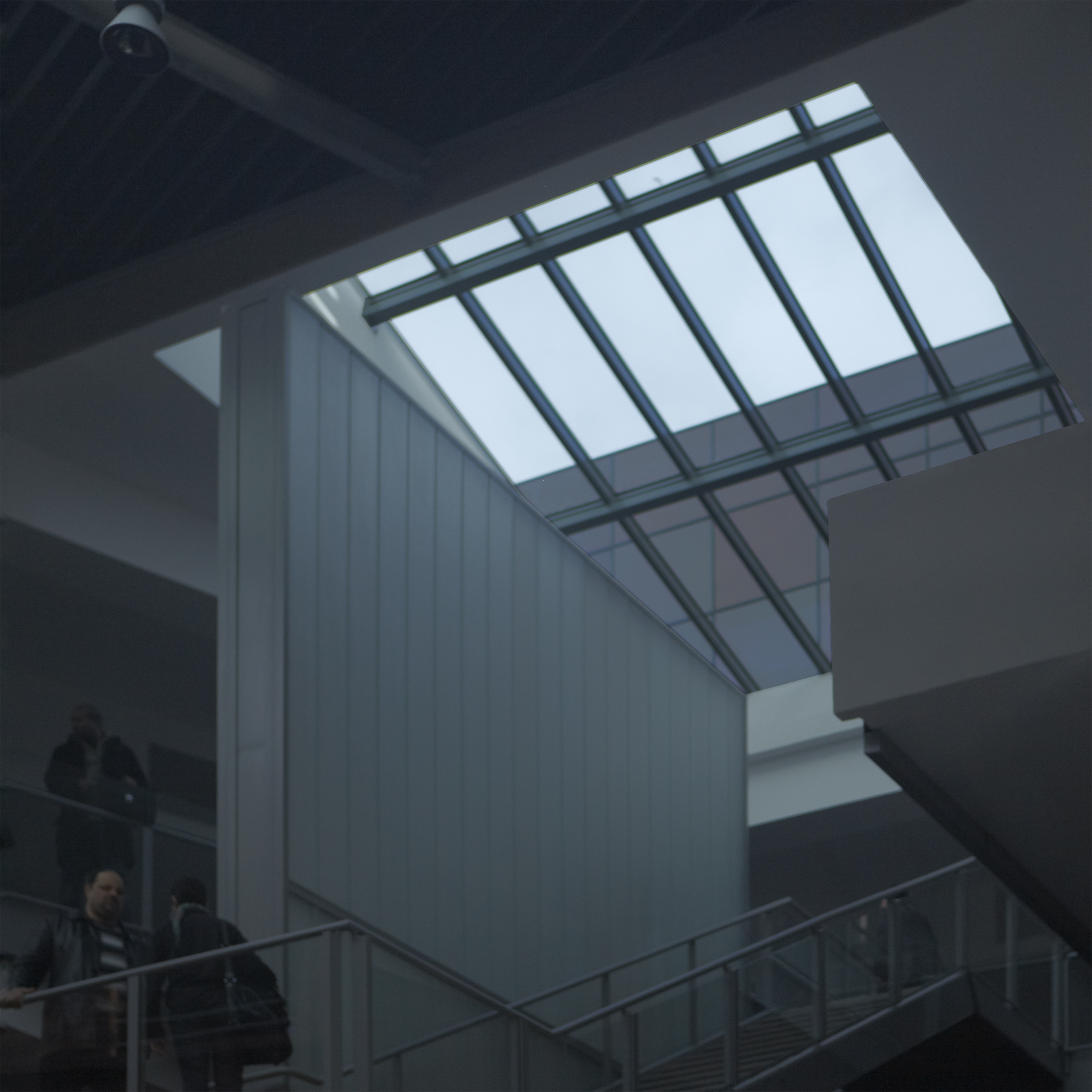 Les panneaux photovoltaïques marrons employés sont positionnés avec de légères différences d’angles pour créer un camaïeu de teintes depuis l’atrium. De plus près, la surface parait plus homogène et réfléchissante. Elle devient miroir qui reflète le ciel en haut de l’escalier, avec plus ou moins de variations suivant les axes de vision et du soleil. L’aléa est donc ici distanciel, analogique et climatique (quand il est génératif et numérique dans l’œuvre lumière électrifiée du sas).