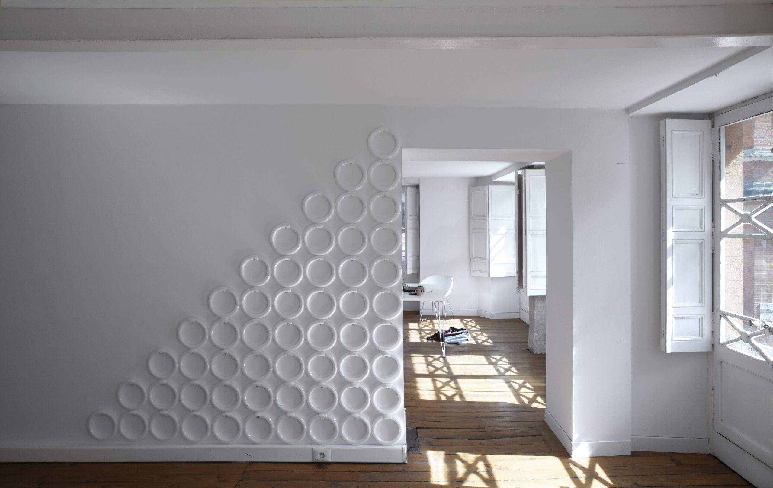 exposition ''je préférerai ne pas'' - ekito - toulouse - 2011 / circlines ( tubes néon circulaires ) - clous / 200 cm x 200 cm